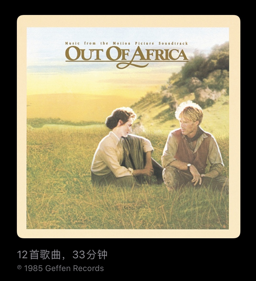 我听音乐的面不是太广,但是电影原声经常听。《走出非洲》这一张是保留的专辑,从mp3时代开始就一直下载并保存它。很久以来,电影的剧情已经淡忘,但是它的配乐旋律一直记着,音乐激起的是广阔的非洲草原的视觉意像。